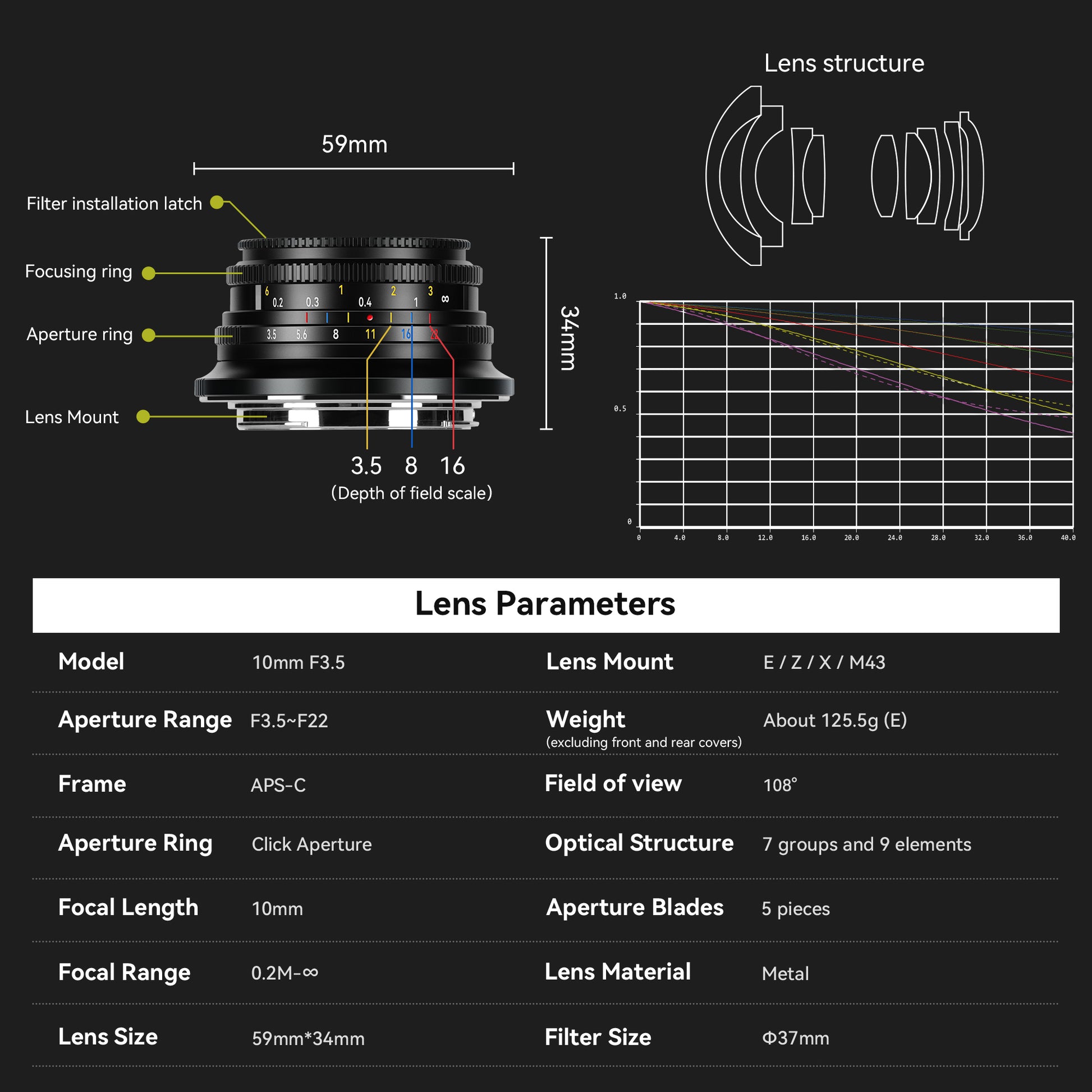 | Model | 10mm F3.5 | Mount Available | E/FX/M43/Z |