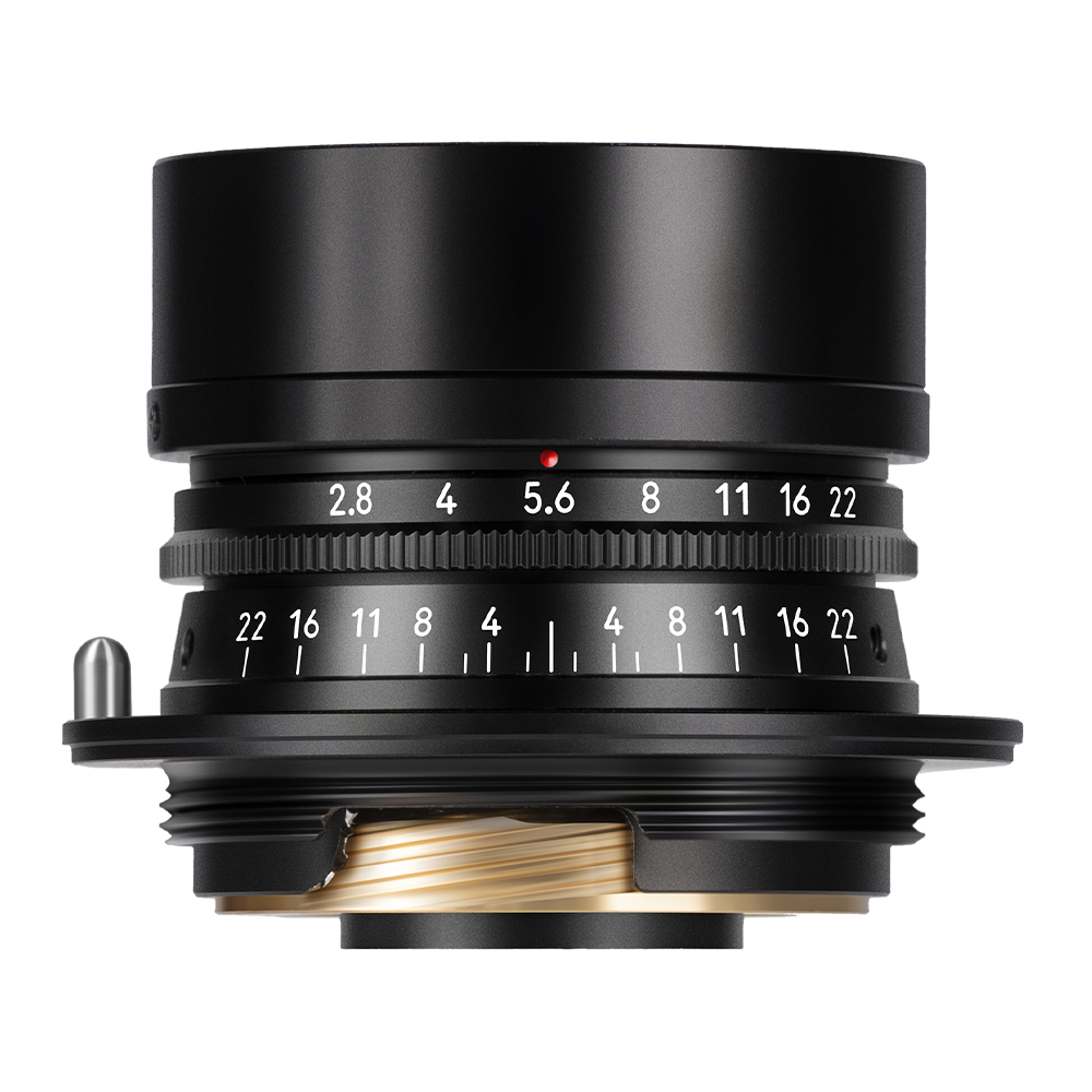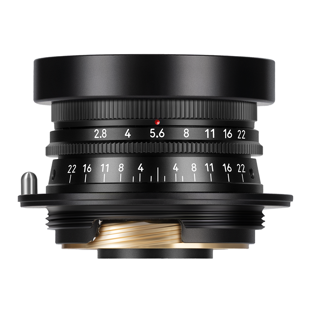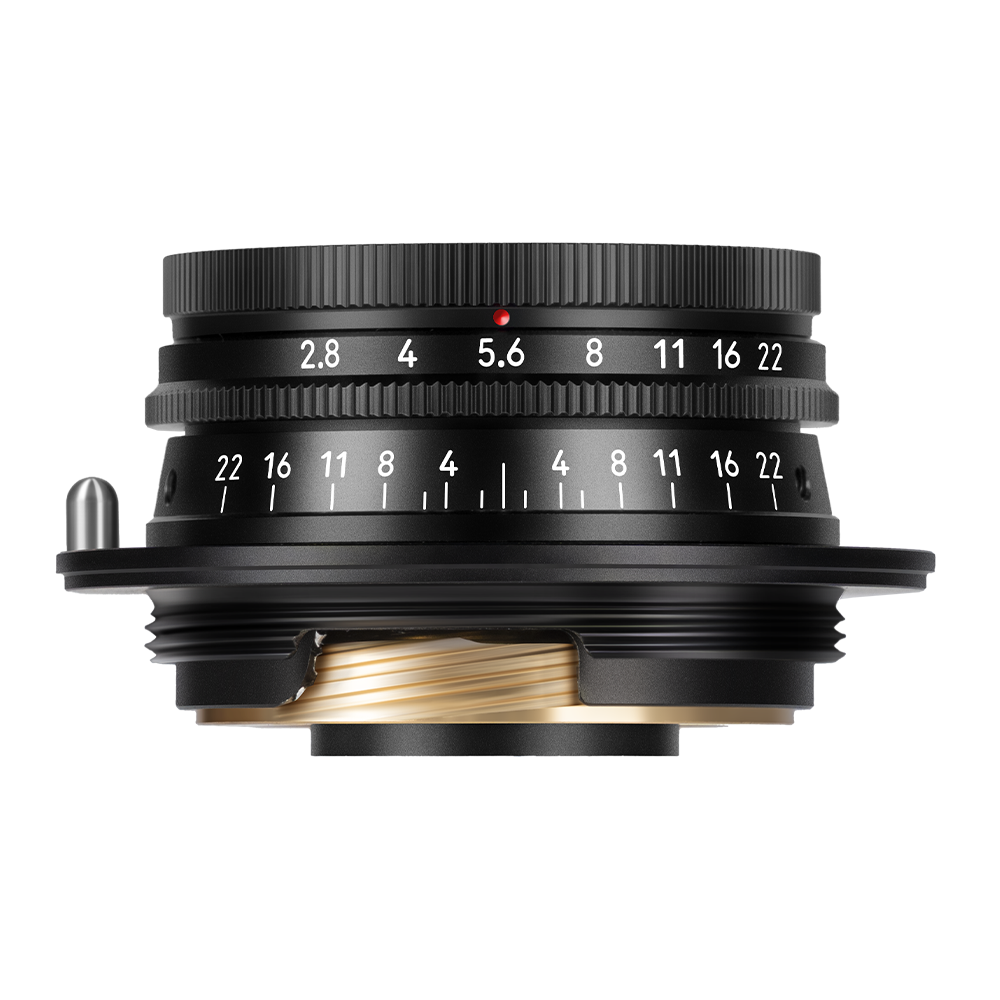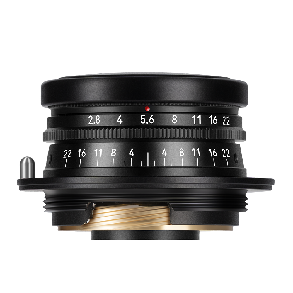 The lens uses a 34mm filter thread and comes with a custom ultra‑thin protective filter. Thanks to its slim 20mm profile, even with the included all‑metal cylindrical lens hood, it barely blocks the viewfinder of any rangefinder camera – ensuring a pure composing experience.